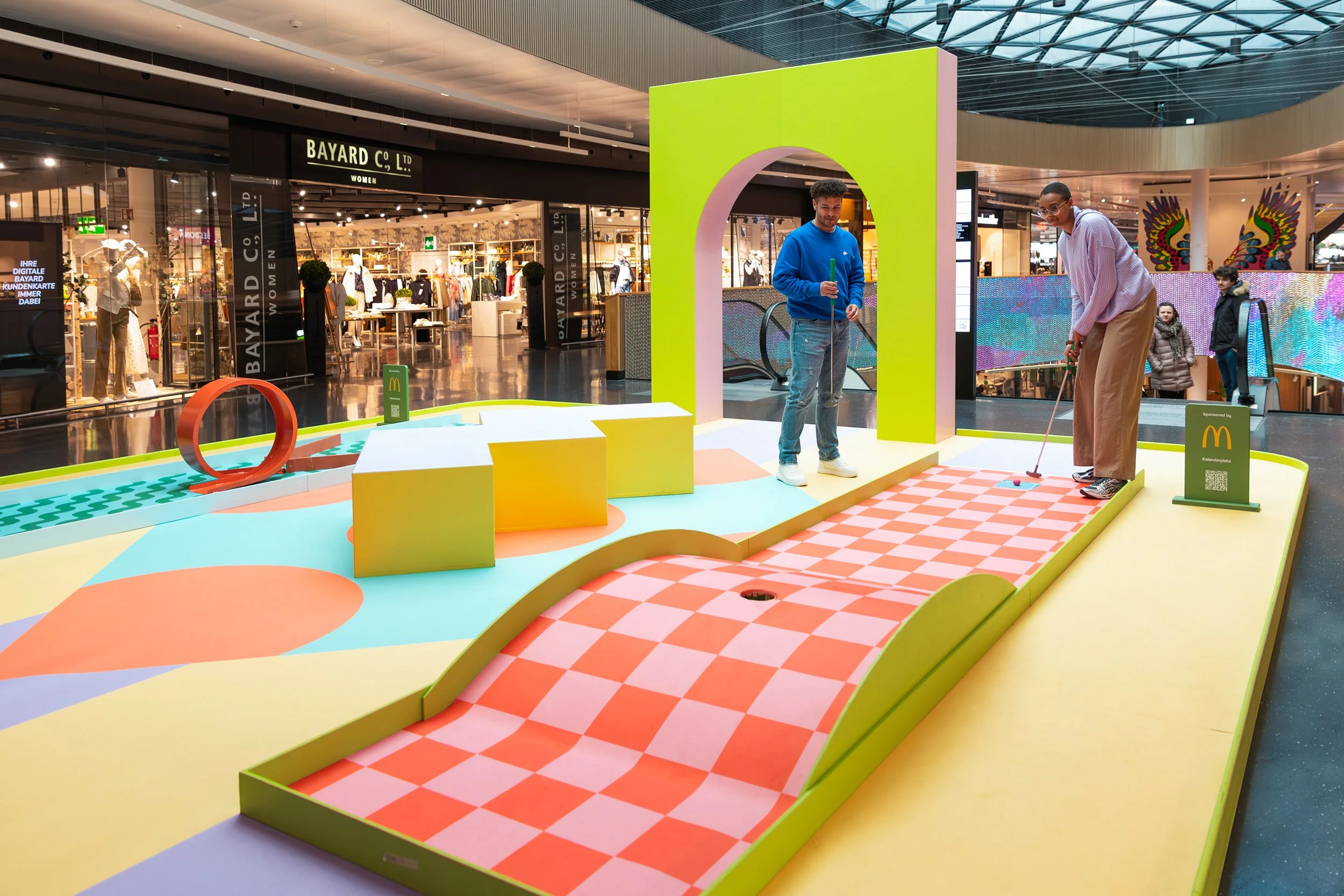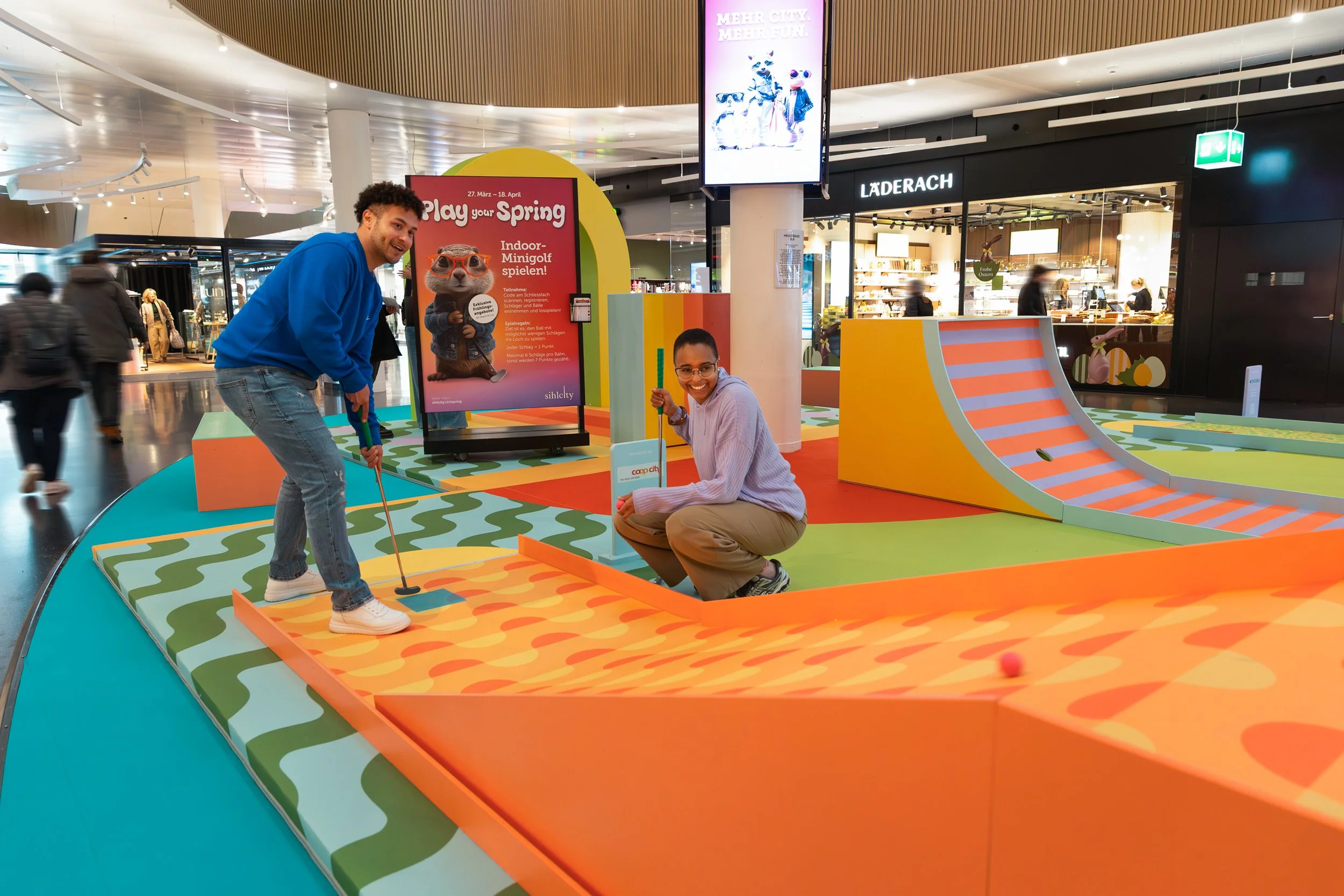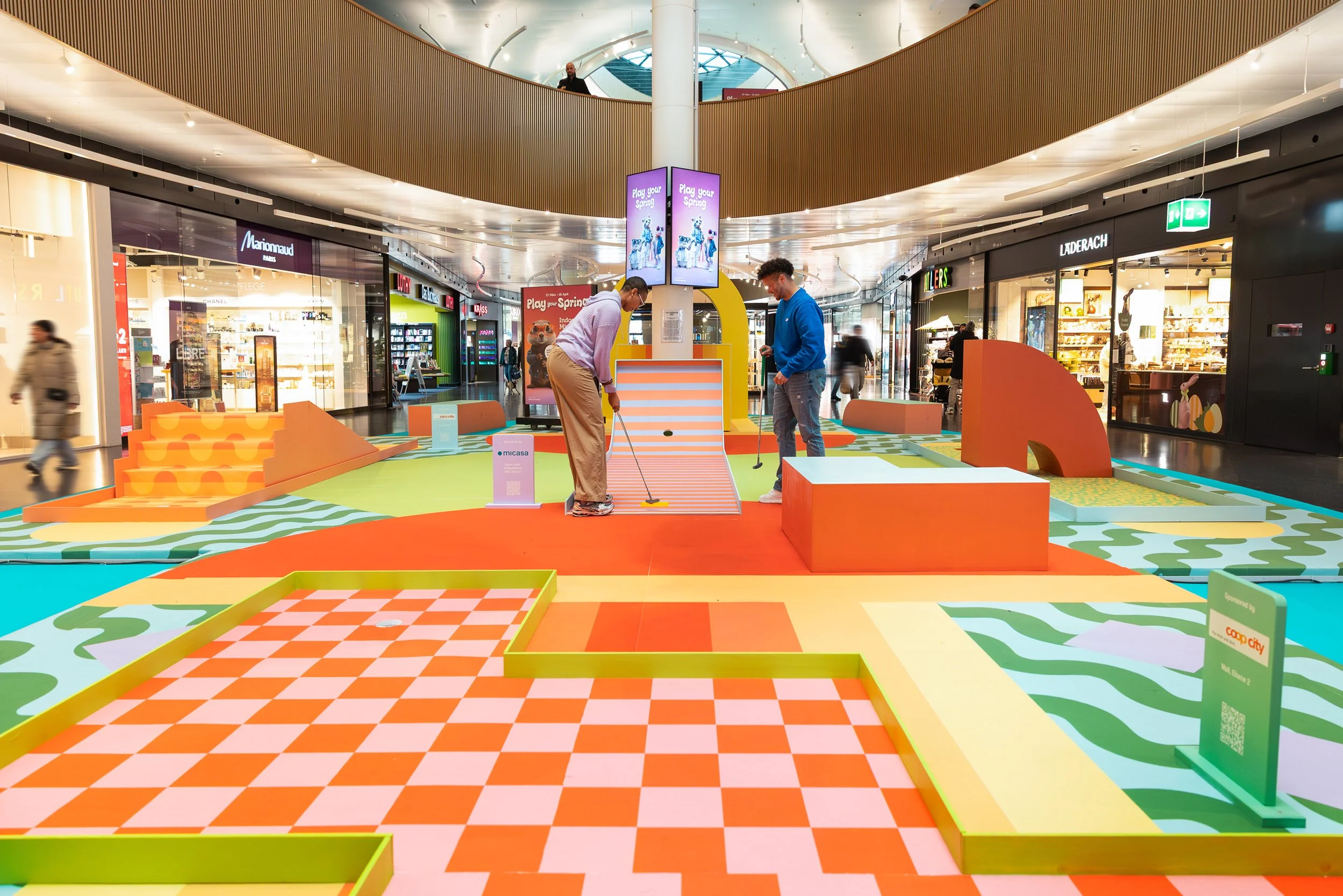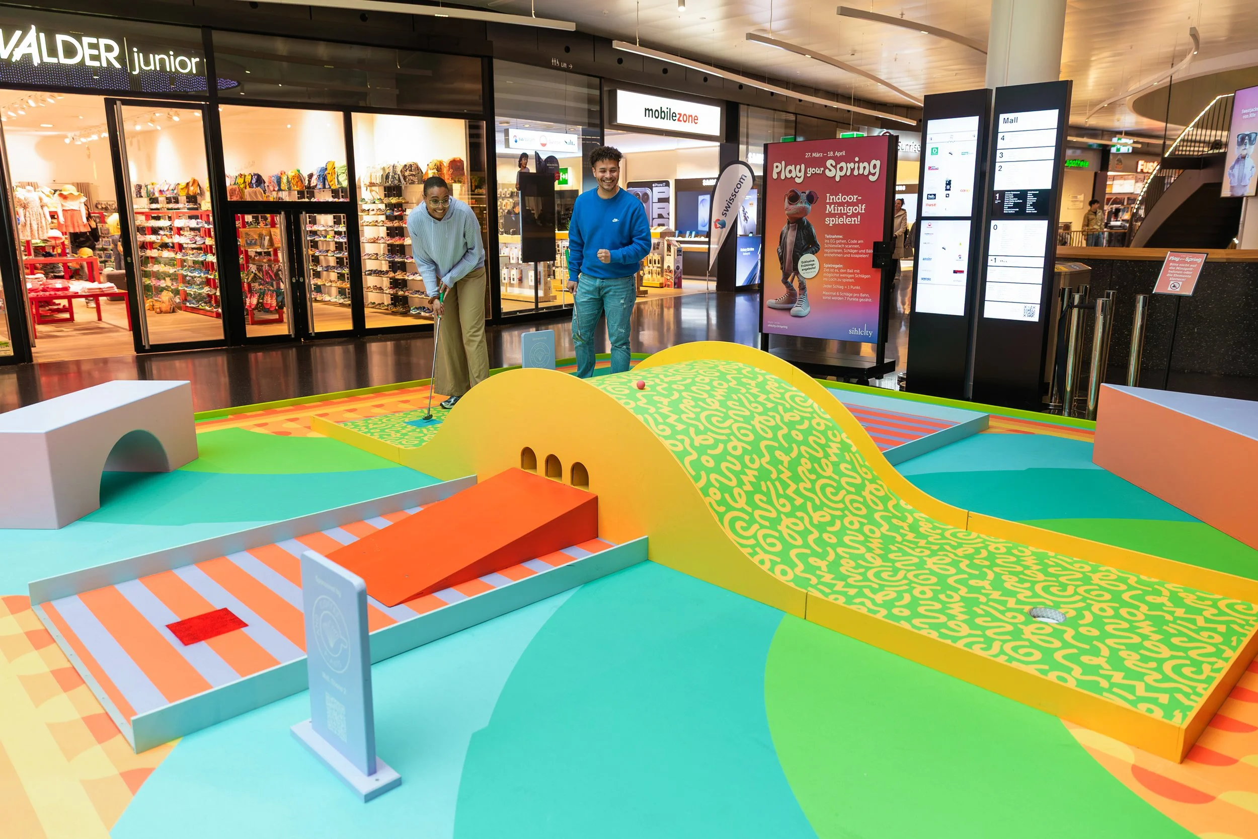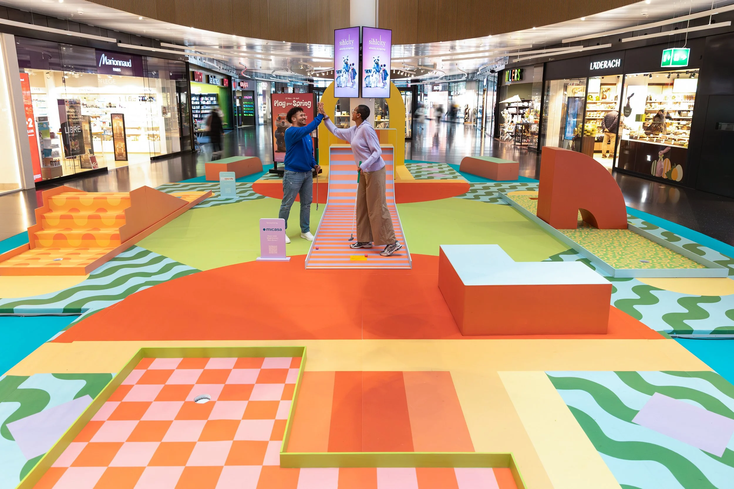 Unter dem Motto «Play your Spring» haben wir für Sihlcity einen einzigartigen Playground mitten im Einkaufszentrum realisiert. Auf drei Etagen erwartet die Besucher eine aussergewöhnliche Minigolf-Erlebniswelt mit neun individuell gestalteten Bahnen.